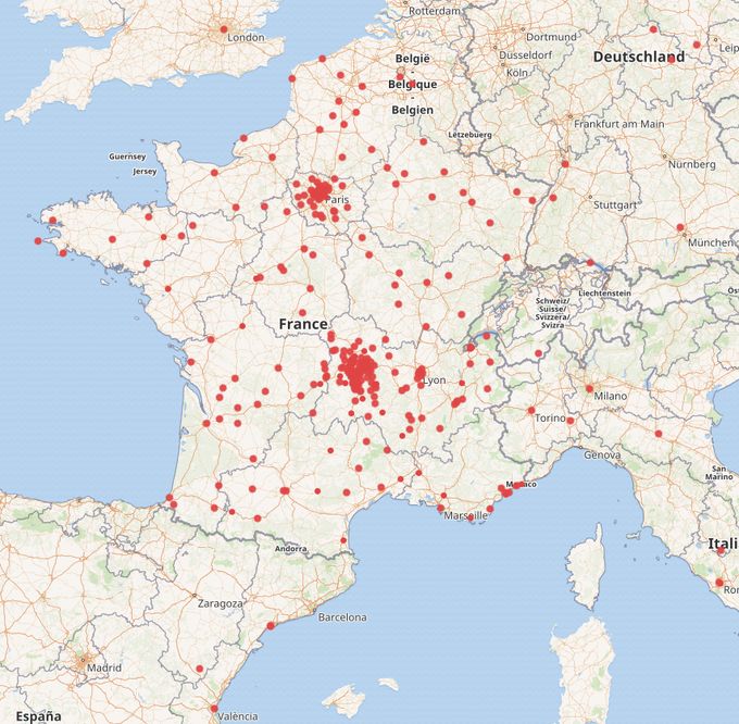 Mais pourquoi ces copier-coller de requêtes, alors qu'il y a des ressources pour apprendre le SPARQL ??? D'abord à titre de pense-bête perso des supers requêtes patrimoniales de @belett, de crainte qu'elles ne qui ne disparaissent corps et âme avec feu-Twitter (pour l'âme de Twitter, c'est déjà trop tard). Dans le monde du numérique et du web, il n'y a par ailleurs souvent rien de mieux pour apprendre que de modifier des copier-coller de code déjà faits, en changeant les paramètres (surtout quand on n'a pas le temps de se plonger dans lesdites ressources, tutoriels et autres supers vidéos). Aveu : j'ai paramétré et généré cette carte des femmes ayant un identifiant FranceArchives (avec calque par siècle) à partir de la requête cartographiant Carte des lieux de naissance des joueurs de l'ASM...