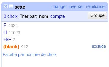 C'est ainsi qu'en multipliant les différents filtres et facettes, le nombre de lignes non genrées diminue drastiquement. En moins d'une heure, 95% des données ont pu être genrées (le petit pourcentage restant étant essentiellement dû, dans le cas présent, à la qualité moyenne de l'OCR de départ). Les femmes représentent ici plus de 25% des individus de l'index !